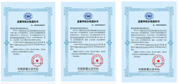 据悉,本次审核由中国质量认证中心于2025年10月23日至24日开展,重点核查两江建设公司质量管理、环境管理体系与职业健康安全管理体系的运行实效。经全面评定,审核组确认该三大体系持续符合标准要求,证书所载名称、地址、认证范围等关键信息均无变化,准予继续使用认证资质,为后续企业发展筑牢合规基石。
